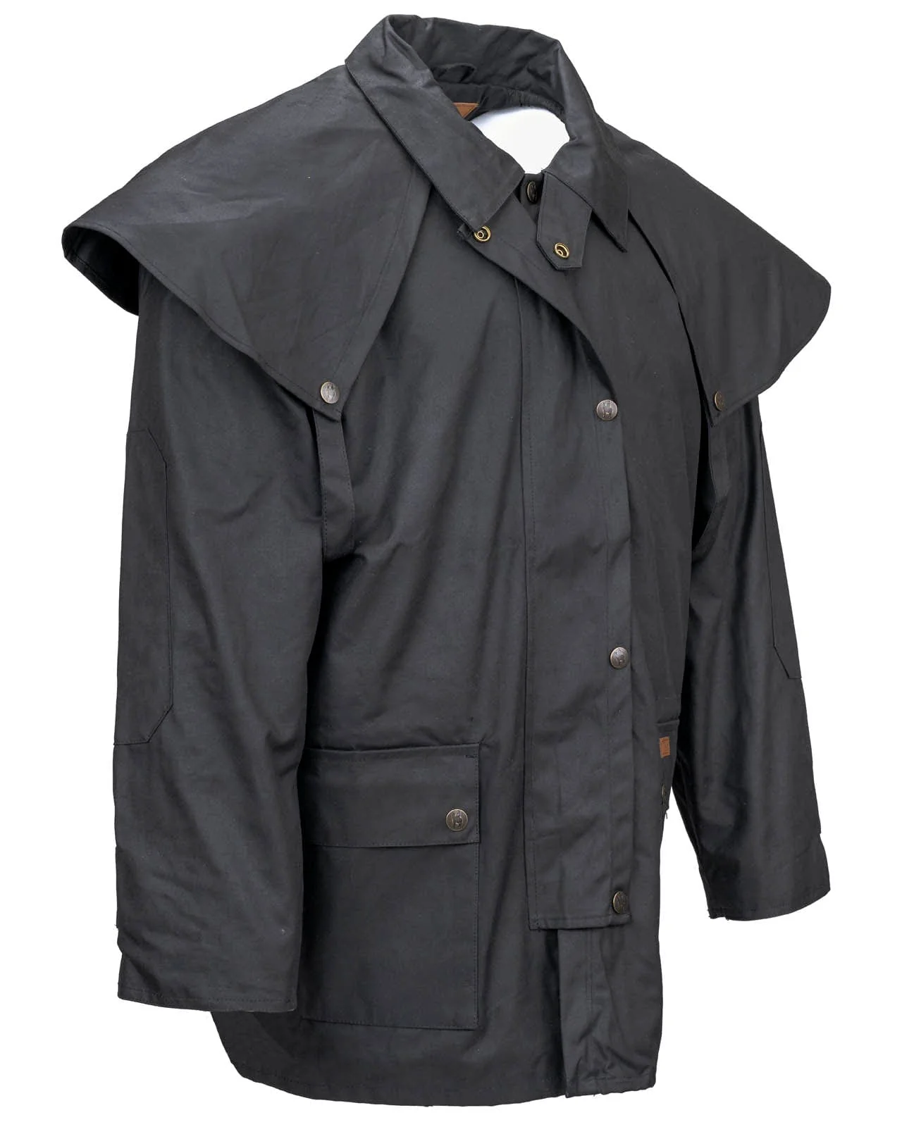Functional details like a detachable cape, dual snap closure, storm flap, throat latch, snap riding gussets, dual-entry hip pockets, inside security pocket, drawstring waistband, and snap-adjustable cuffs make it as versatile as it is rugged. Compatible with the Oilskin Hood, the Bushranger is perfect for those who want all the protection of a duster in a shorter, more nimble design.